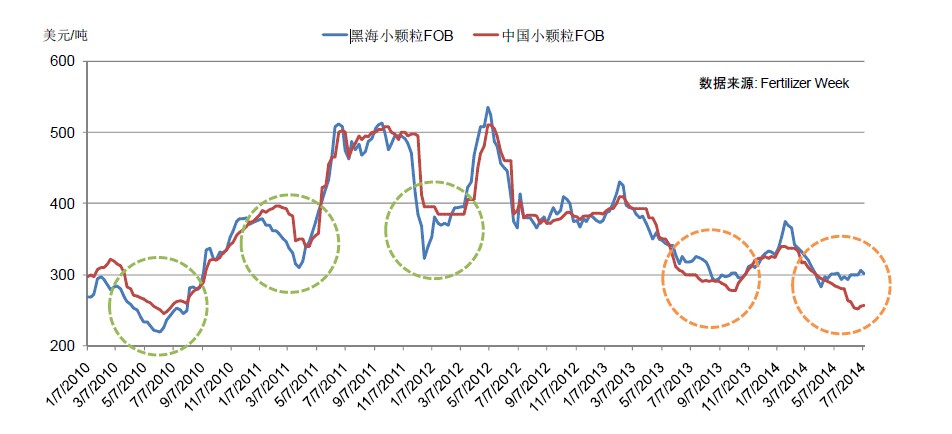 自2013 年5 月末以来,全球尿素市场出现了一种新现象。历史上,在全球尿素价格阶段性探底的过程中,中国尿素出口价格总是高于作为全球小颗粒尿素市场基准的黑海FOB 价,并随着黑海FOB 价格的企稳回升而上涨(如下图绿圈内显示)。但全球尿素市场在2013 年二、三季度的探底过程中,中国出口价格首次低于黑海FOB 价格,并且在中国价格企稳回升后,黑海FOB 价格才得以一路上扬(下图橙色圈内显示)。这种现象在今年二、三季度再度上演。本文从尿素产能扩张及成本的变化角度深度分析这种新现象产生的原因及其对行业的中期影响。