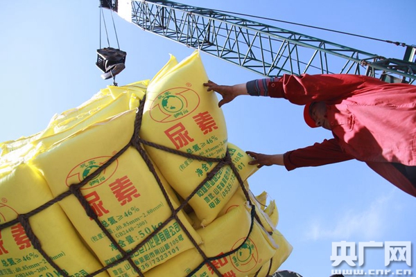 在烟台港43号泊位,工人们正有条不紊地把一袋袋刚刚通过铁路运来的国产尿素拆包、筛分、破碎、清理装船。5万吨尿素全部装完一艘船总共用时不到24个小时。一天后,这艘船将启程开往印度。